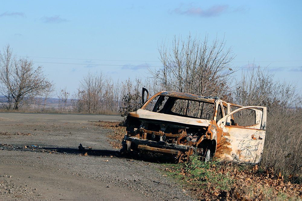 A nouveau, je suis seul au milieu du vide, du chaos. Chaotique mais beau. Les ocres, roux et bruns clairs de la ferraille, le soleil et le ciel bleu, les arbres déplumés et les feuilles de l’automne composent un tableau graphiquement plaisant à regarder. Cela n’est cependant plaisant que si l’on n’oublie que des personnes ont été tuées ici. Et puis c’est potentiellement dangereux. Quelle est la probabilité qu’un engin explosif soit toujours opérationnel ? La zone n’a été reprise qu’il y a deux mois et rien n’indique que ce véhicule date de l’offensive initiale en mars ou de la contre-attaque de septembre. La seule chose avec laquelle il faut composer est que le déminage n’a pas été la priorité de l’armée puisque quasiment plus personne n’habite dans la région. La vigilance doit donc rester omniprésente, à l’image des écriteaux "Mines !" qui pullulent un peu partout. Je ne m’approche pas à moins d’un mètre et j’abandonne l’idée d’ajouter un cliché à ma série Fragments. Une, deux, trois et enfin quatre prises de vues.