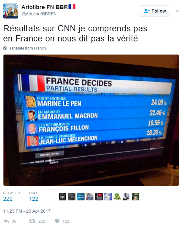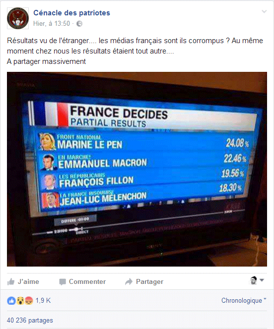 Ce qui est assez inquiétant, c'est que les gens qui souscrivent au propos sont des milliers en quelques heures. Des hommes et des femmes qui ne s'attachent qu'à deux choses : le titre "Les medias français sont-ils corrompus ?" et le fait que le tableau place Marine Le Pen en tête avec 24,08%. Peu importe qu'il y ait écrit en aussi gros "Partial results" ou que l'on puisse lire l'heure de cette capture d'écran, soit 23h00 environ.