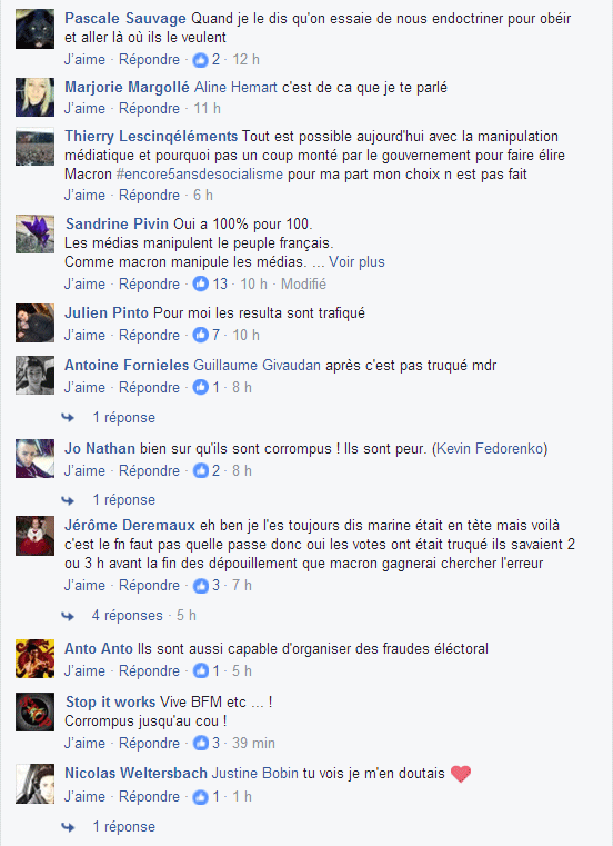 Et comme les électeurs du front National sont souvent persuadés que le complot est partout, les commentaires, qui dépassent rapidement le demi-millier, abondent en ce sens. Petite sélection au fil des heures ::