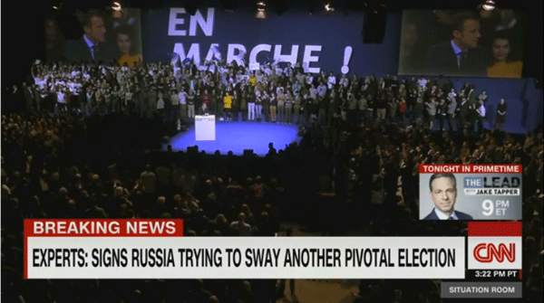 Arlolibre FN BBR est une page Twitter soutien de la candidature de Marine Le Pen aux présidentielles de 2017. Avant de développer, on précisera que le cliché publié sur Twitter n'est pas une photographie instantanée de CNN car toutes les diffusions de cette chaîne se font avec le logo caractéristique rouge vif en bas à droite telle sur cette copie d'écran ci-dessous d'une émission consacrée à Emmanuel Macron le 24 avril. Le cliché publié sur Twitter est celui d'un replay d'une émission puisque apparaît clairement en bas à gauche l'inscrustation "Différé -01:00" et la datation "23h00" sur un bandeau qui se superpose et qui masque le logo CNN à droite :