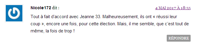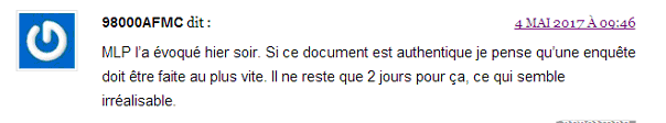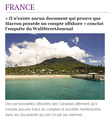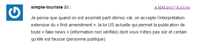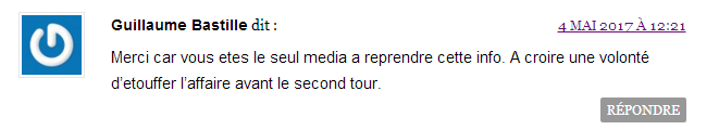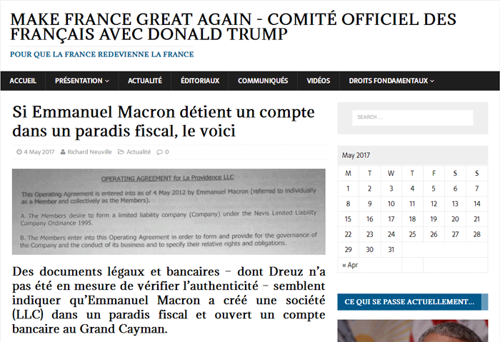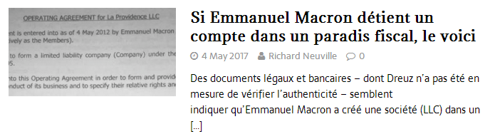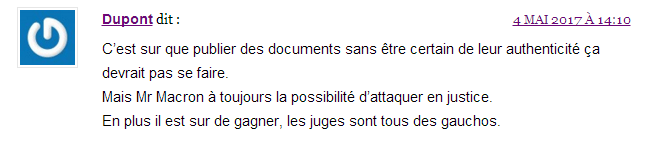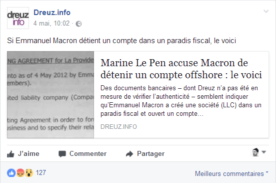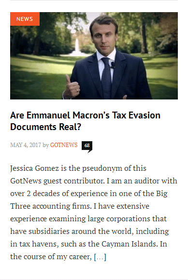 L’émetteur est un site d’informations sur le net, Dreuz.info. Un site qui dit s’attaquer aux mensonges des médias au travers de son accroche de haut de page d'accueil : Une accroche complétée un peu plus bas sur la page d’accueil par : « Dreuz est un site américain conservateur, chrétien et pro-israélien. Comme nous sommes tout ce que les journalistes détestent, ils nous appellent "fachosphère" ! » Le plus étonnant, c’est la conclusion du texte, traduit de l’américain : « À mon avis, il n’y a aucune raison de supposer que ces documents sont faux. » On commencera par noter que – ce dont il ne s'en cache pas – Alain Leger traduit un article. Avec une petite modification tout de même. Pas si "petite" que cela puisqu'il s'agit du ... titre. En effet si le titre sur Dreuz est « Les documents d’évasion fiscale de Macron sont authentiques », le titre sur le site Got-News est exactement « Les documents d’évasion fiscale d’Emmanuel Macron sont-ils authentiques ? ». Que dit l’article du 4 mai 2017 ? S’ensuit un déferlement de commentaires de cris de vierges effarouchées, de bonnes âmes touchées, de haros sur le complot parmi lesquels nombreux sont ceux qui se justifient par le fait que la candidate du FN a parlé de ce compte aux Bahamas la veille lors du débat en invitant les téléspectateurs à vérifier par eux-mêmes sur internet :