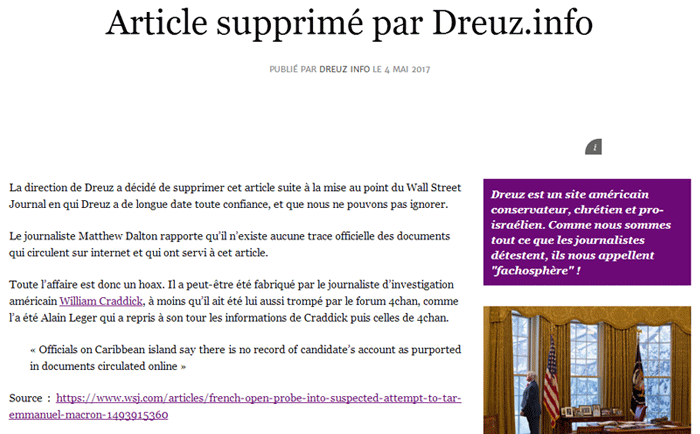 Visiblement, face au procédé particulièrement malsain et le mensonge avéré, le site Dreuz décide alors de totalement retirer son article :