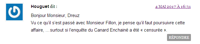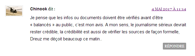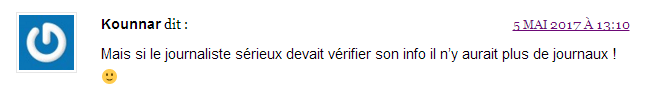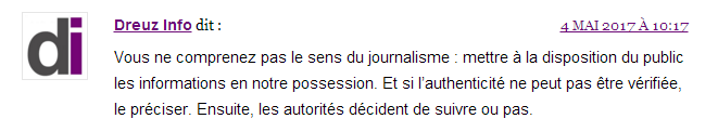 Surtout, la page Facebook du site Dreuz.info affiche toujours le 6 mai en début de soirée l’information et rien n’indique que le papier est un faux. Quand on sait que la majorité des gens partagent et commentent au seul vu du titre et des premiers mots, on peut se demander si la démarche du site Dreuz.info de supprimer les articles est vraiment honnête. Car pourquoi ne pas le supprimer aussi de la page Facebook qui doit (normalement) faire plus de vues que le site ? Surtout que malgré le retrait sur le site, le lien continue d’être partagé sur le réseau Facebook. En conclusion, au travers de ce simple exemple, voici la démonstration que quand on ne respecte pas les impératifs journalistiques de base, on se retrouve bien vite dans le mensonge et la désinformation. Limage dessinée par ces articles et jetée en pâture auprès du grand public reste présente dans les esprits, salissant celui sur qui le dévolu a été jeté : impossible de vraiment s’en laver. Un peu comme quand on a cassé des œufs pour faire une omelette : impossible de repartir de l’omelette pour reformer des œufs. © Thierry Birrer – 5 et 6/05/2017 Complément. Le 5 juin 2017, le site Numerama s’est attaché à entrer plus précisément dans le détail technique de cette manipulation grossière décrite dans le premier article d’Alain Léger et visant à attaquer Emmanuel Macron. C’est à lire ici. Nota juridique : Dans cette explication, aucun nom n'est masqué sur les copies d'écran puisque les pages du site Dreuz ou de la page Facebook de Dreuz sont des pages totalement publiques sans nécessité d'être "ami" pour en lire le contenu et les commentaires attachés.