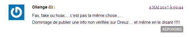 Une mise à jour qui prête à sourire pour deux raisons : la première c’est parce qu’elle se base sur un article d’un média classé comme souvent « mensonger » par Dreuz, la seconde c’est qu’en moins de cinq minutes, n’importe quel internaute pouvait vérifier que l’origine de l’information émanait d’un personnage peu sérieux. Face aux reproches alors énoncés par certains internautes tel ce « dommage de publier une info non vérifiée », le site se défend en répondant que l’internaute ne comprend pas son métier de journalisme :