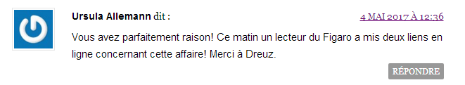 Certains, ne s’attachant qu’au titre, sautent allégrement sur les rectificatifs et commentaires et n’hésitent pas, quittent à se faire railler, à enfoncer le clou : « Merci car vous êtes le seul à reprendre cette info » ou « Vous avez parfaitement raison (...) Merci à Dreuz ».